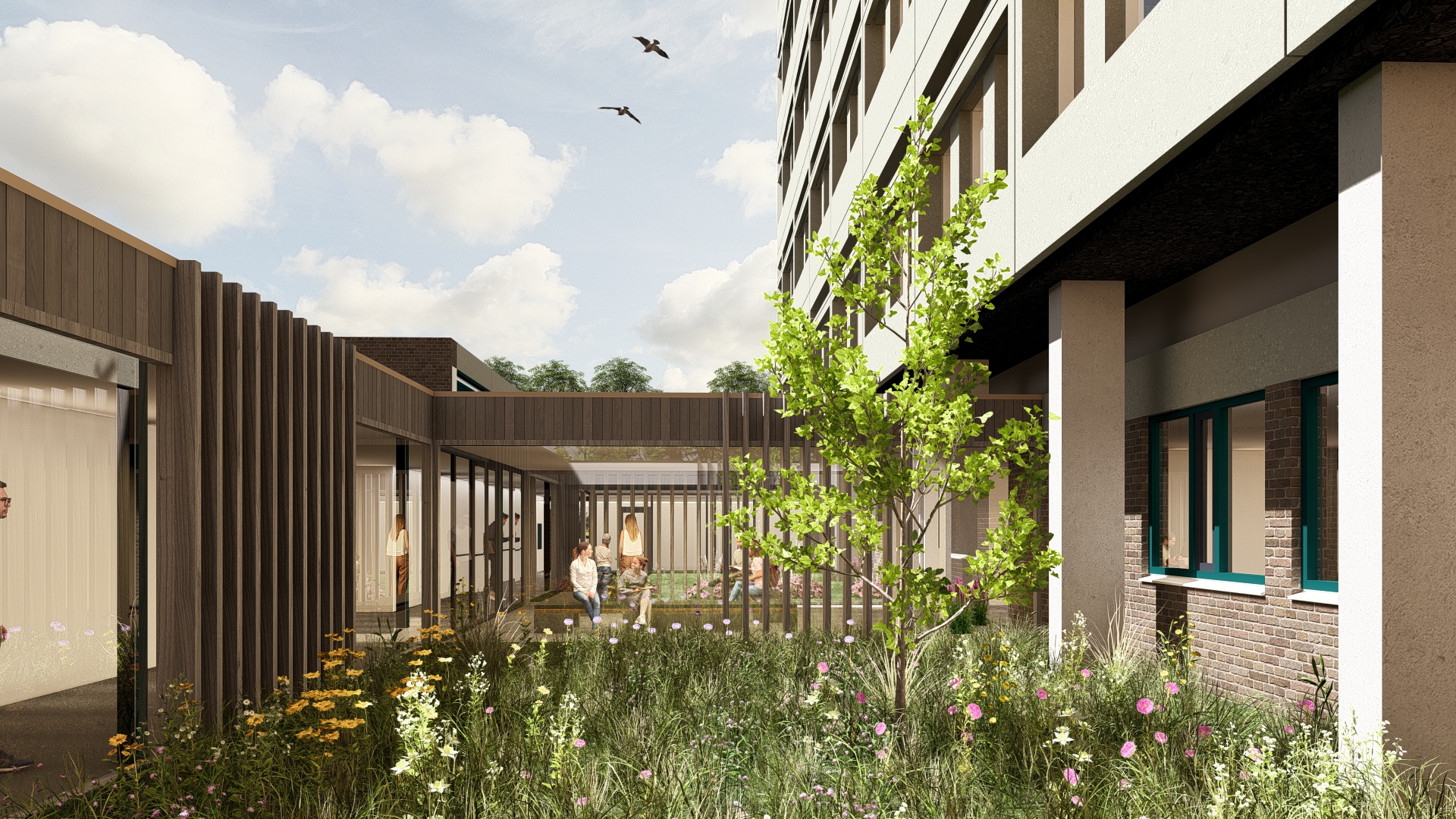 - Begane grond: centrale ontvangst met voorbereidings- en poliplein, slimme aanmeldzuilen, gedeelde spreek- en onderzoekskamers, directe toegang tot de groene westkant.