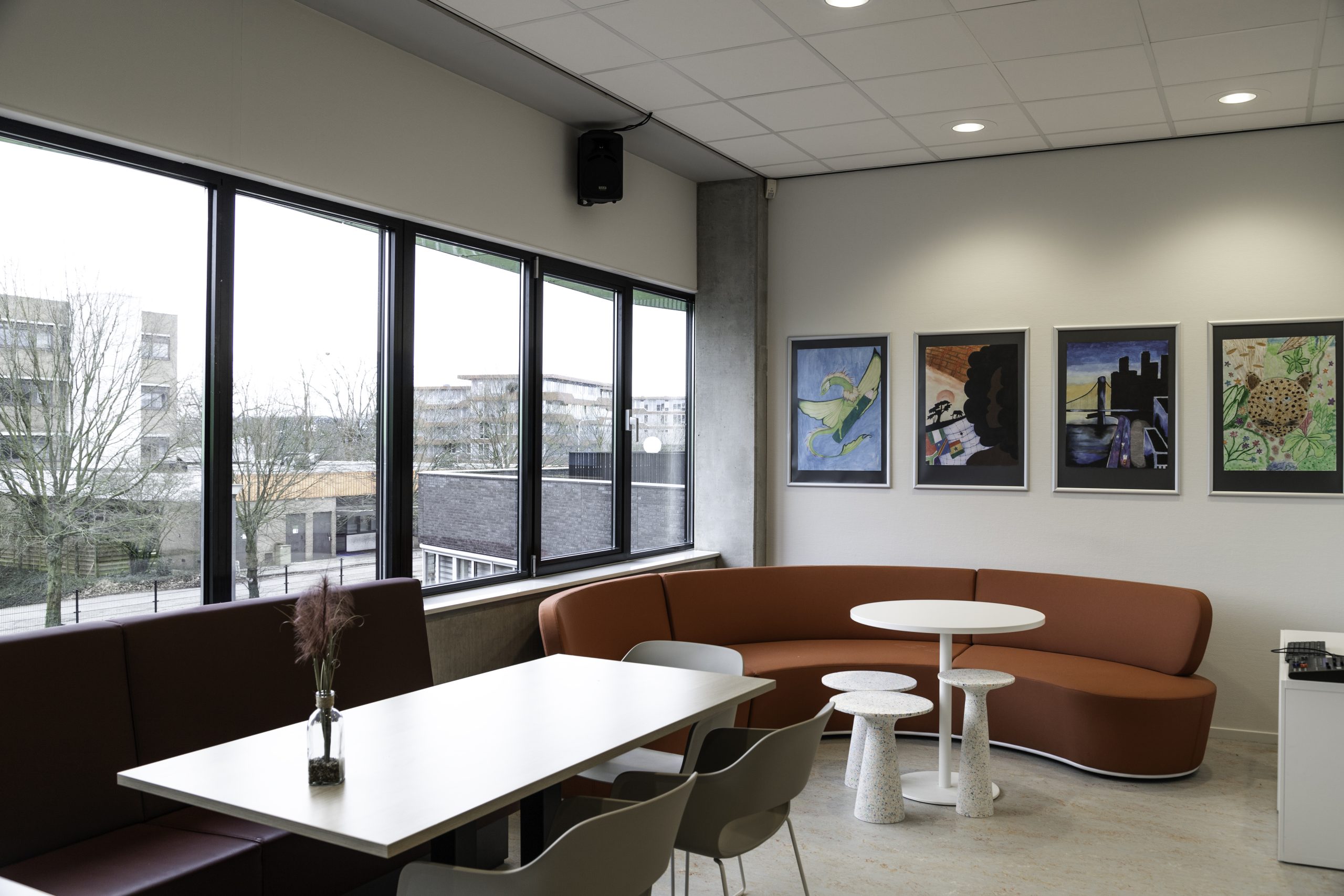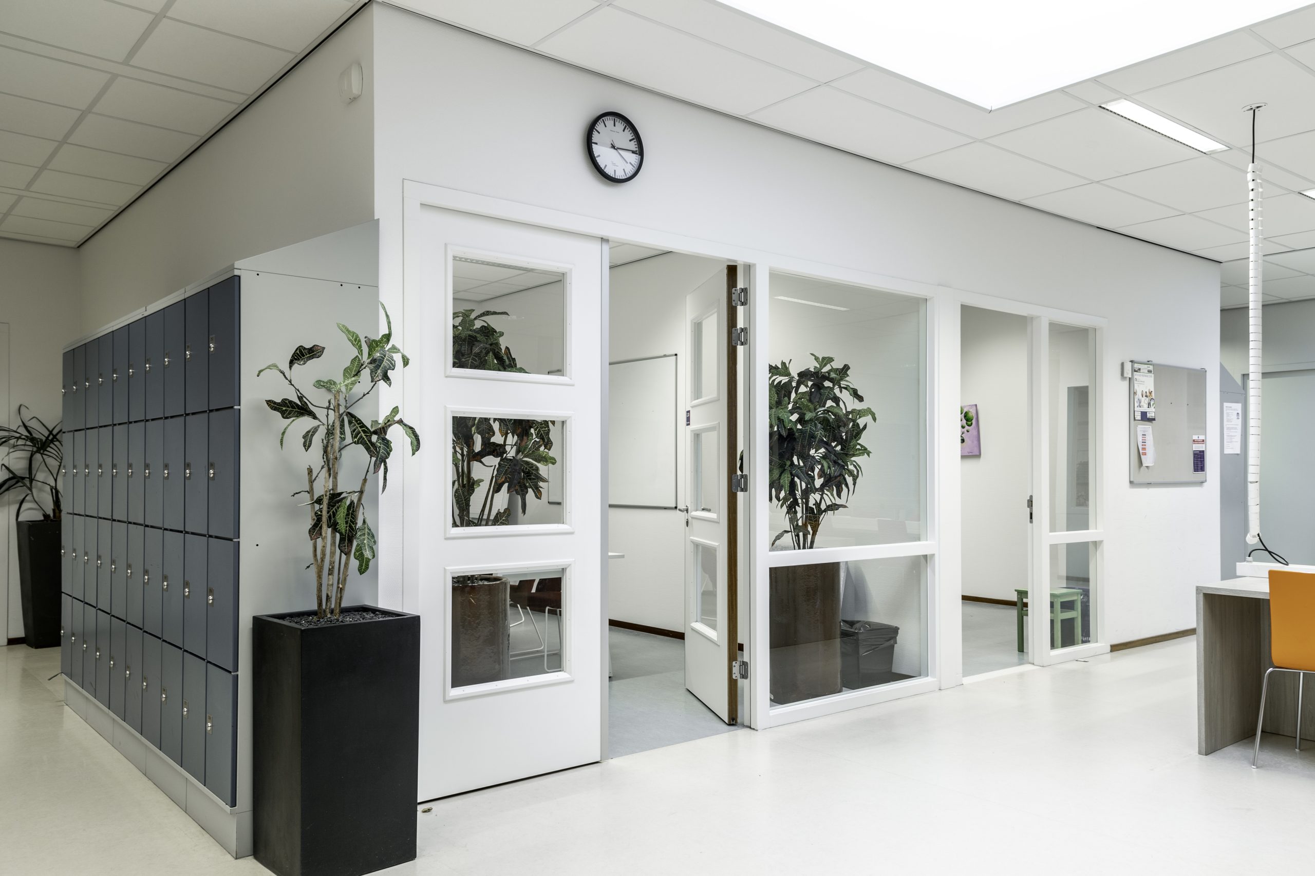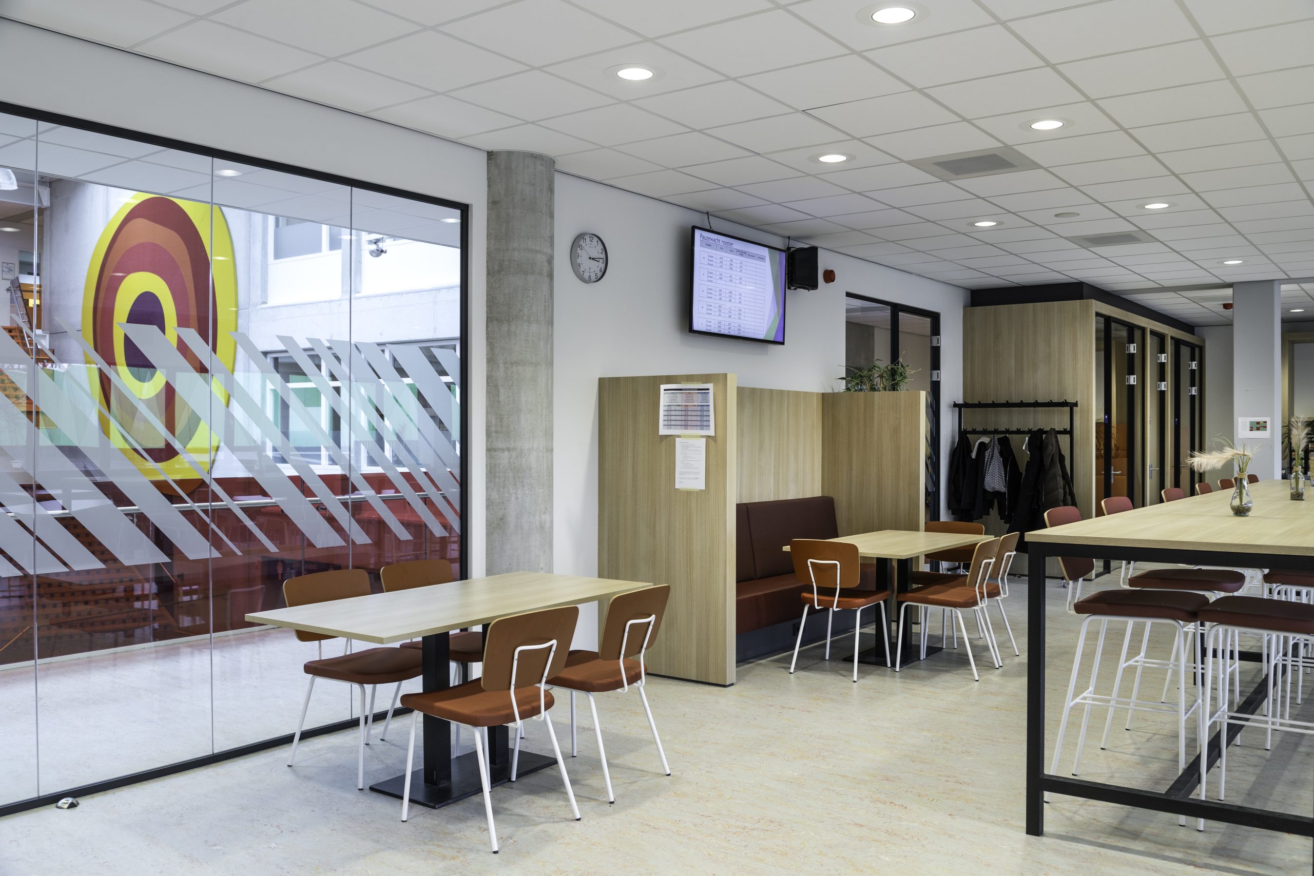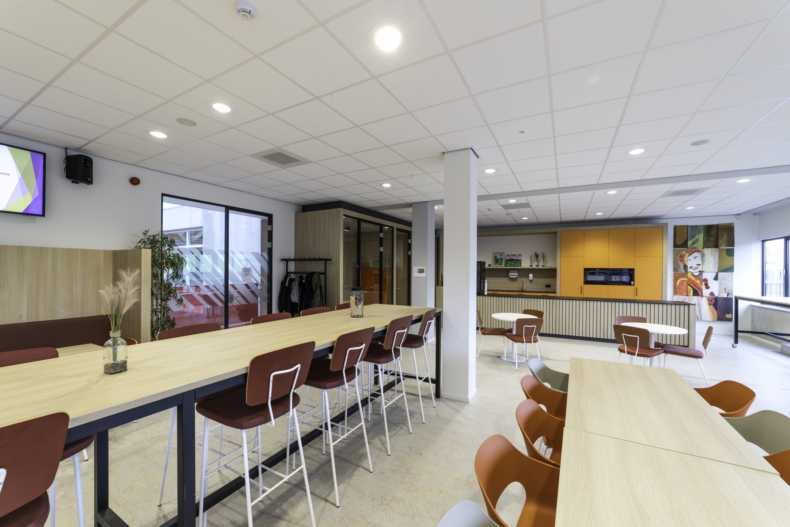 Onze werkzaamheden vonden plaats op twee verdiepingen. Zo hebben we onder meer een nieuwe kantine met stilteruimtes voor het personeel gemaakt, diverse lokalen aangepast en ontmoetingsruimtes, vergaderruimtes, kantoortjes en een pantry gerenoveerd. Ook hebben we de afdeling groenvoorziening uitgebreid, een toegang tot en uitbreiding van het dakterras bij de lerarenkamer gecreëerd met hergebruik van het bestaande terrashekwerk. En voor de opleiding zorg & welzijn lokalen gerealiseerd in voormalige open ruimtes die ze nu afzonderlijk kunnen afsluiten. Op de afdeling Bestuur en Managementondersteuning hebben we een overlegruimte gecreëerd waarvoor bestaande deuren zijn gebruikt.