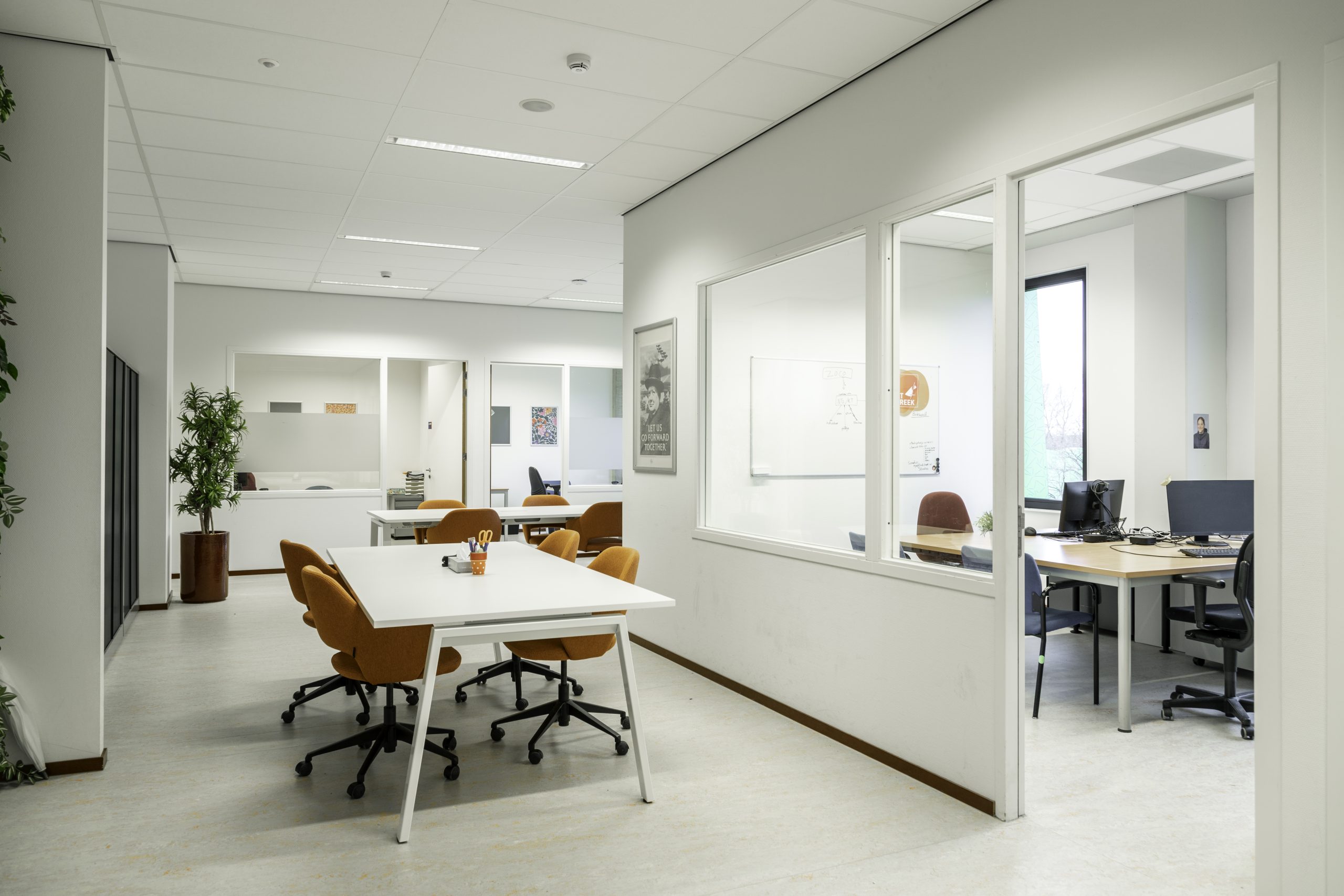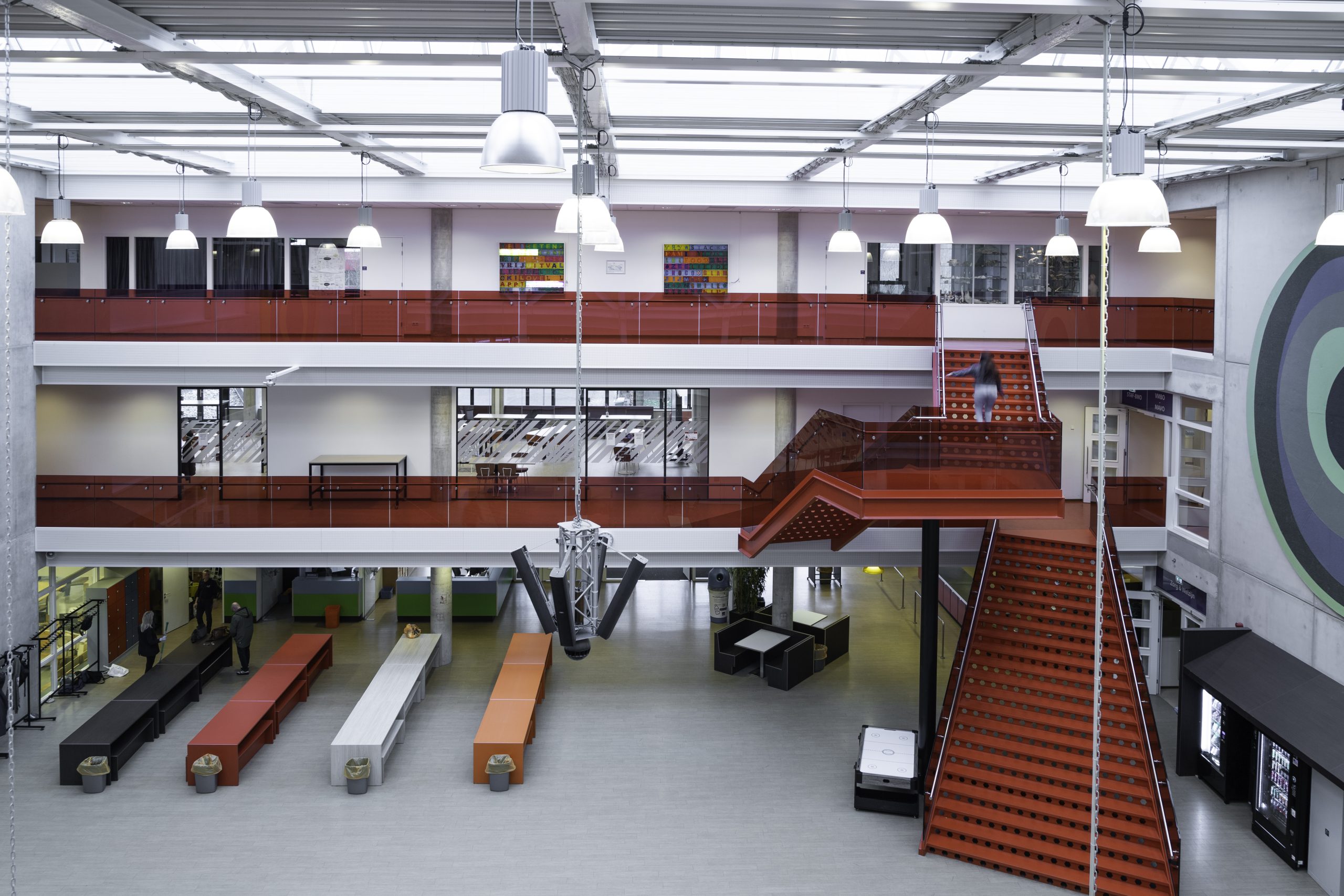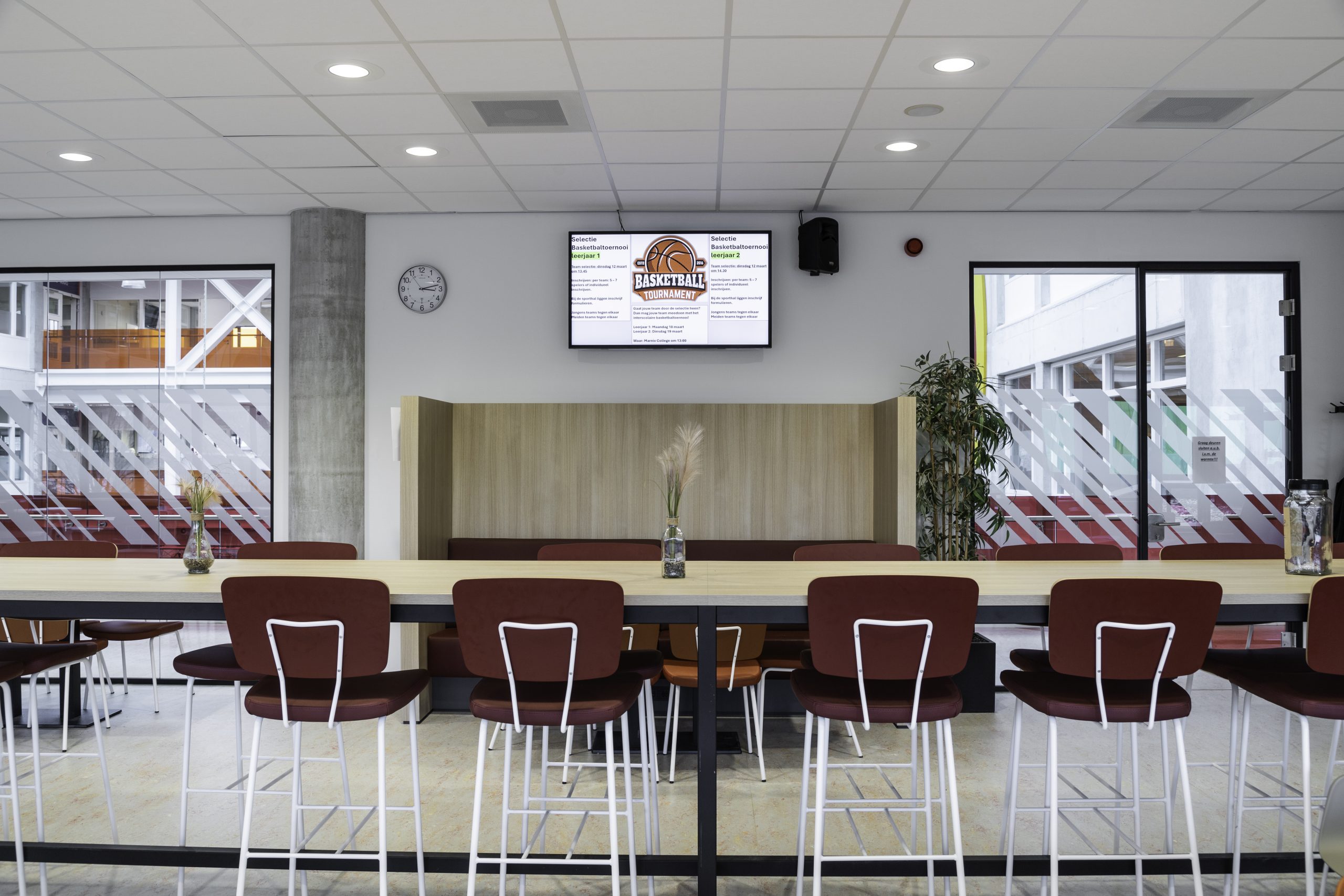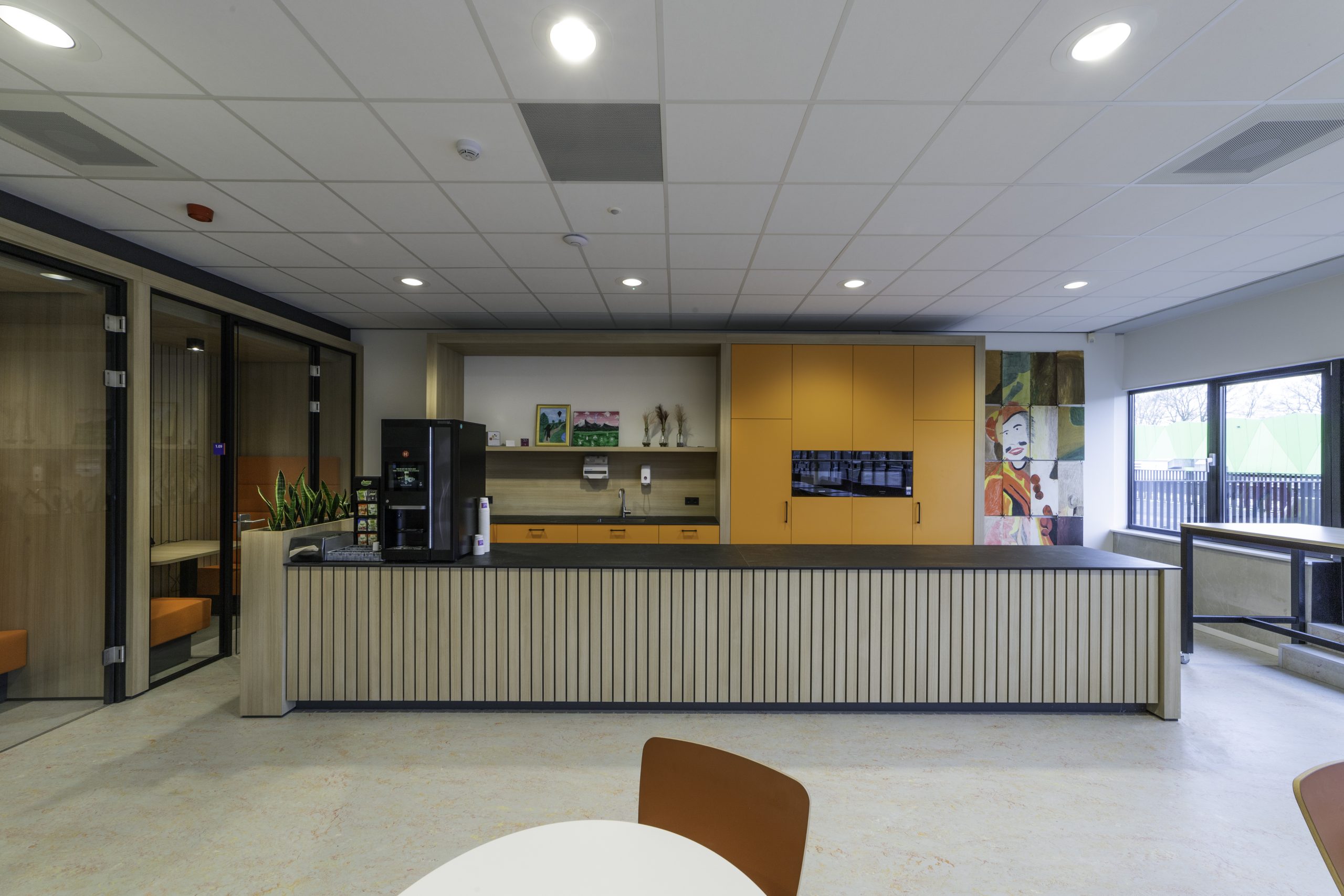 Onze werkzaamheden vonden plaats op twee verdiepingen. Zo hebben we onder meer een nieuwe kantine met stilteruimtes voor het personeel gemaakt, diverse lokalen aangepast en ontmoetingsruimtes, vergaderruimtes, kantoortjes en een pantry gerenoveerd. Ook hebben we de afdeling groenvoorziening uitgebreid, een toegang tot en uitbreiding van het dakterras bij de lerarenkamer gecreëerd met hergebruik van het bestaande terrashekwerk. En voor de opleiding zorg & welzijn lokalen gerealiseerd in voormalige open ruimtes die ze nu afzonderlijk kunnen afsluiten. Op de afdeling Bestuur en Managementondersteuning hebben we een overlegruimte gecreëerd waarvoor bestaande deuren zijn gebruikt.